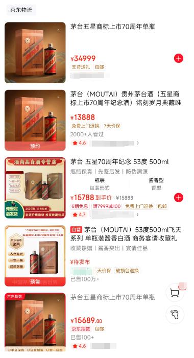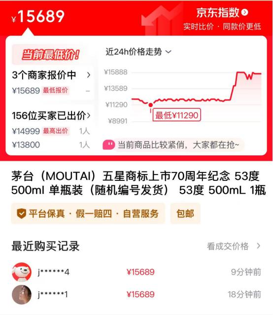 记者在闲鱼、阿里财富拍卖等平台看到,贵州茅台酒(五星商标上市70周年挂念)的报价接近14000元/瓶,比拟发售价接近翻倍。而在京东相关商家中,广泛报价为15000元/瓶傍边,但也有商家报价达到34999元/瓶。